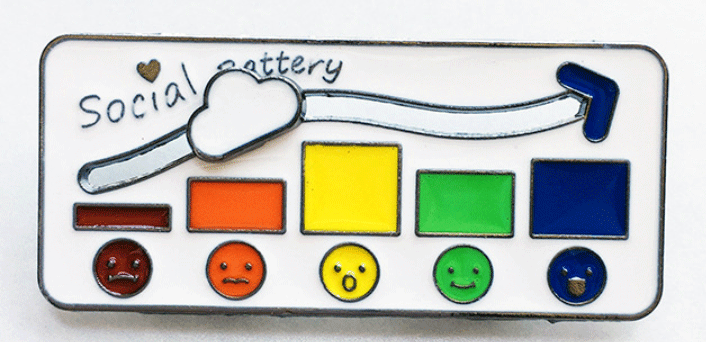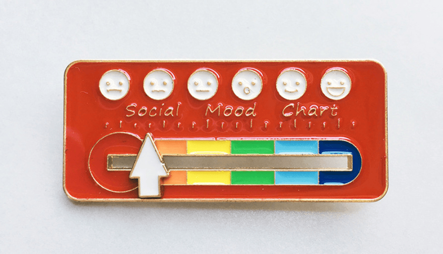Cartoon Designs, this Brooch lapel pin tracks your social battery and mood. Its colorful emoticon scale helps anyone easily signal their energy needs gently.
